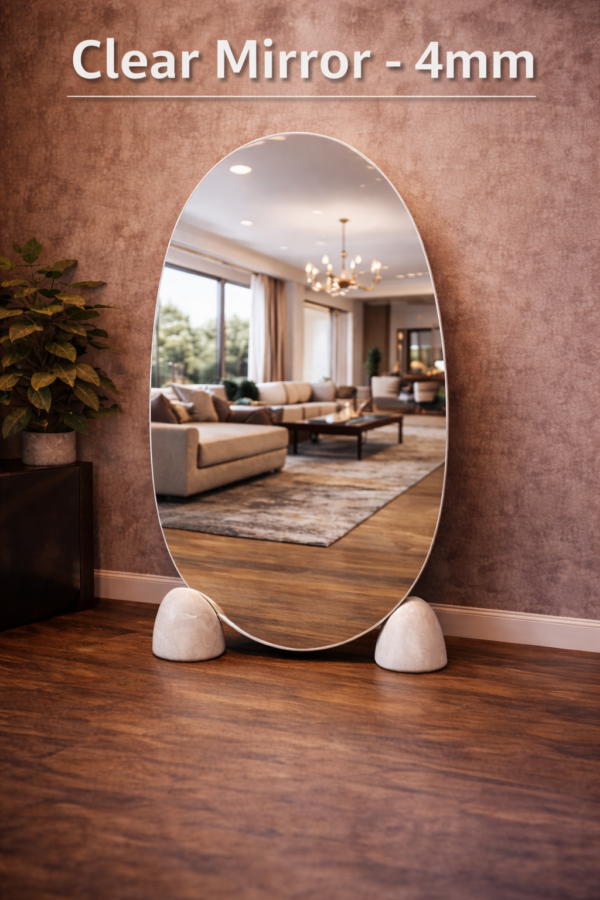 A premium-quality Clear Mirror with a glass thickness of 4 mm, manufactured using copper-free technology and finished with two protective paint layers. This ensures superior resistance to corrosion and humidity, extended durability, and consistent high-quality reflection over time.